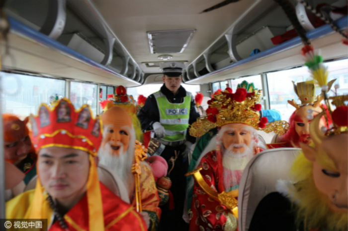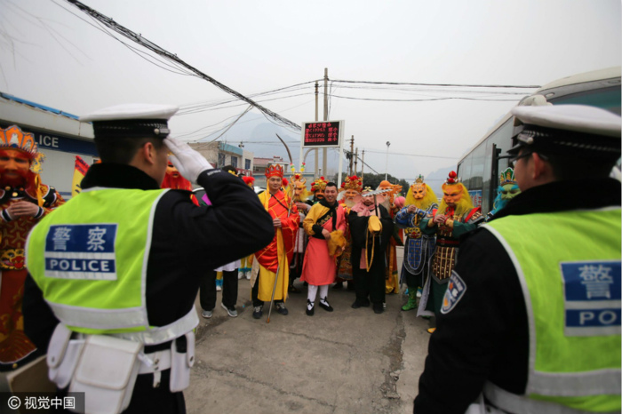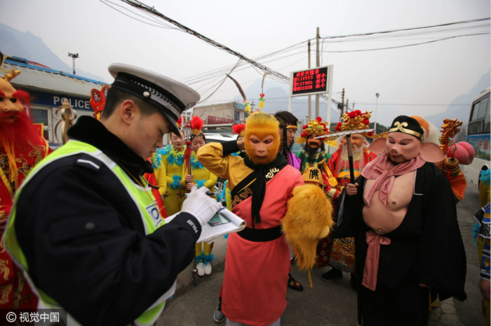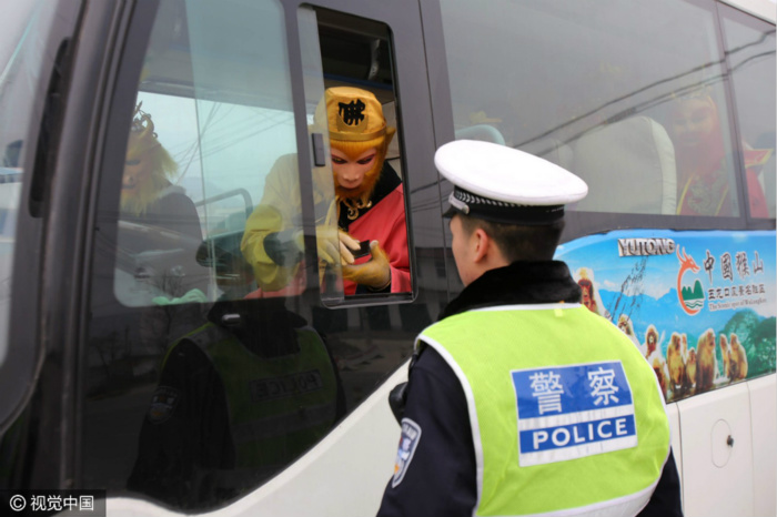 Henan, 09/02/2017 (El Pueblo en Línea) - La policía de tráfico de la provincia de Henan quedó desconcertada después de detener un peque?o autobús que circulaba por la autopista el 7 de febrero con un conductor vestido de Rey Mono y todos sus pasajeros vestidos como personajes de “Peregrinación al Oeste”.
