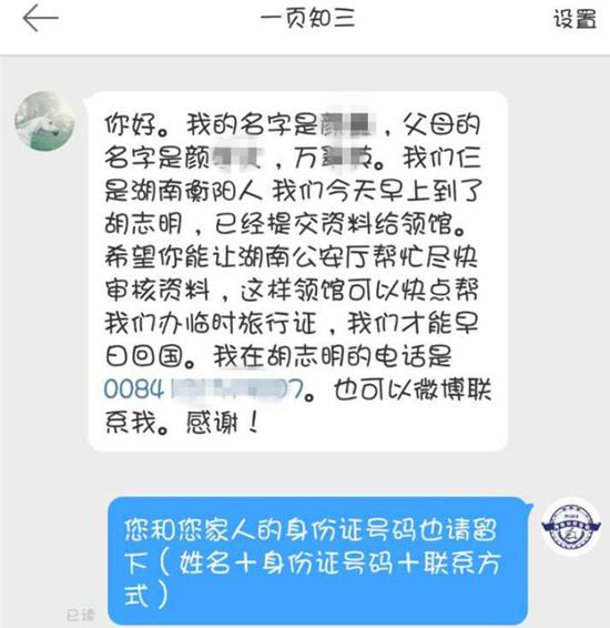 El oficial a cargo de la cuenta oficial en Weiboo del Departamento de Seguridad Pública Provincial de Hunan, mantuvo estrecho contacto con Zhang mientras solicitaba la rápida comprobación de la información personal de Zhang, datos que también habían sido solicitados por la embajada china en Vietnam.