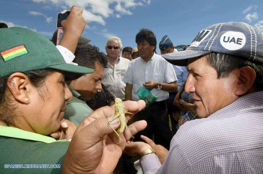 SANTA CRUZ, febrero 10, 2017 (Xinhua) -- El presidente boliviano, Evo Morales (c), inspecciona una zona afectada por una plaga de langostas, en el municipio de Cabezas, en el departamento de Santa Cruz, Bolivia, el 10 de febrero de 2017. El gobierno boliviano anunció el viernes que recurrirá a expertos de Argentina para combatir la plaga de langostas que desde hace dos semanas azota el campo boliviano y que ha acabado con más de 1,200 hectáreas de sembradíos. (Xinhua/R Zaconeta/ABI)