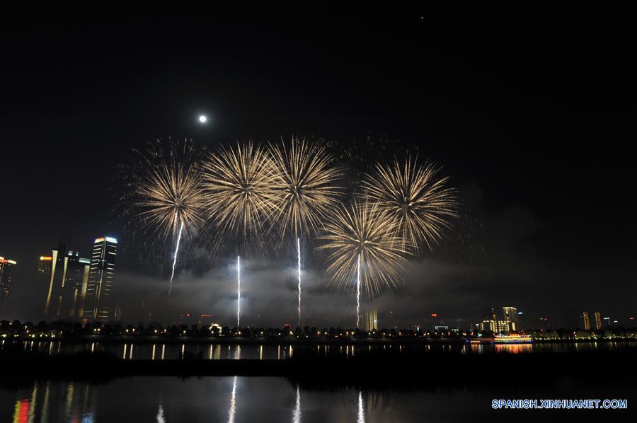 Fuegos artificiales explotan en el cielo para celebrar el Festival de las Linternas en Juzizhou, una isla en el Río Xiangjiang, en Changsha, capital de la provincia de Hunan, en China, el 11 de febrero de 2017. (Xinhua/Long Hongtao)