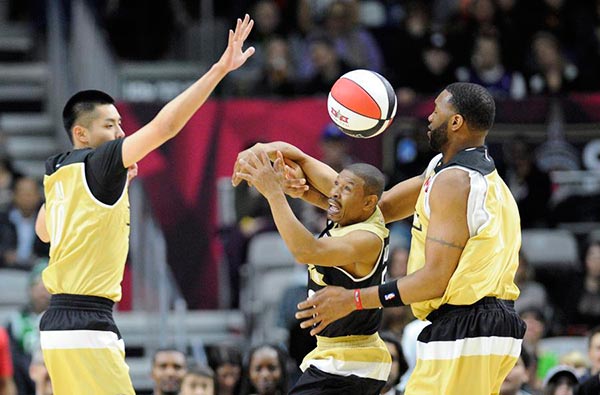 Kris Wu (número 10) observa como su compa?ero Tracy McGrady (derecha) comete falta sobre el jugador estadounidense Muggsy Bogues durante el juego Todos Estrellas en el Coliseo de Ricoh Toronto, Ontario, Canadá. 12 de febrero del 2016 [Foto: Agencias]