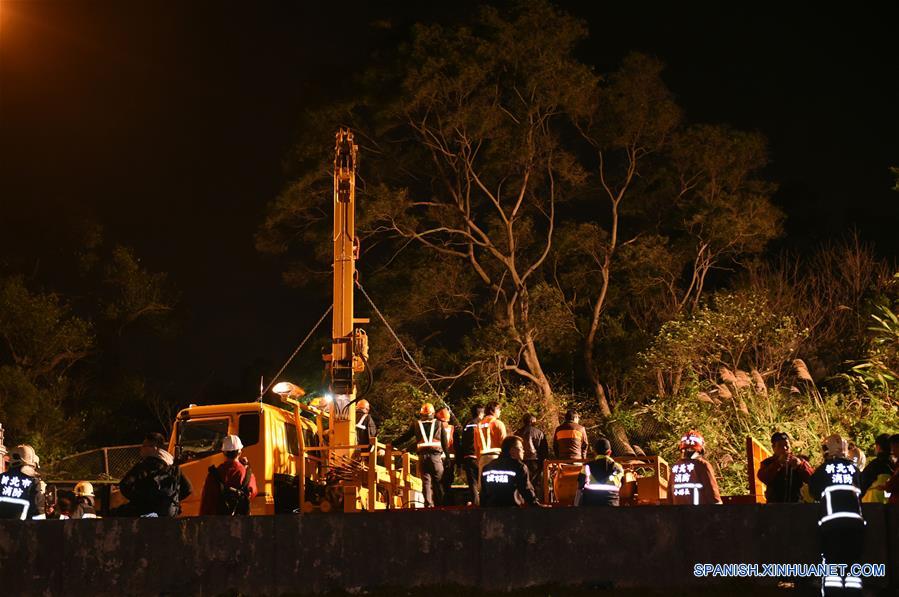 Rescatistas trabajan en el sitio del accidente de un autobús en Taipei, Taiwan, en el sureste de China, el 13 de febrero de 2017. Un autobús volcó el lunes en una carretera en Taipei y al menos 17 personas no muestran se?ales de vida tras el accidente, dijeron las autoridades. (Xinhua/Ou Dongqu)