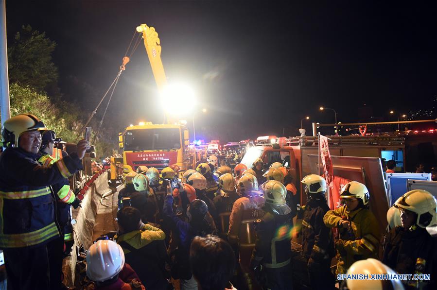 Rescatistas trabajan en el sitio del accidente de un autobús en Taipei, Taiwan, en el sureste de China, el 13 de febrero de 2017. Un autobús volcó el lunes en una carretera en Taipei y al menos 17 personas no muestran se?ales de vida tras el accidente, dijeron las autoridades. (Xinhua/Ou Dongqu)