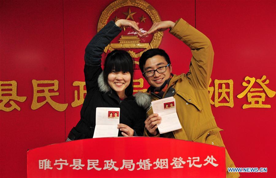Una pareja muestra su certificado de matrimonio en el Registro Civil del condado Suining, provincia de Jiangsu, el 14 de febrero de 2017. Muchas parejas han elegido el Día de San Valentín para sellar su amor. (Xinhua)