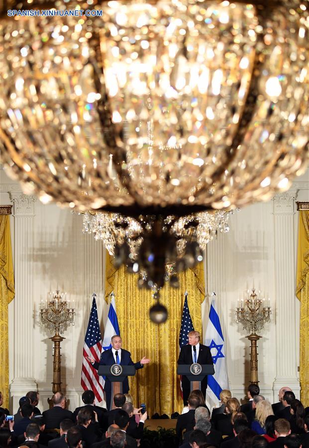 WASHINGTON D.C., febrero 15, 2017 (Xinhua) -- El presidente de Estados Unidos de América, Donald Trump (d), participa durante una conferencia de prensa conjunta con el visitante primer ministro israelí, Benjamin Netanyahu (i), en la Casa Blanca, en Washington D.C., capital de Estados Unidos de América, el 15 de febrero de 2017. Israel debe "frenar un poco" la construcción de nuevos asentamientos, dijo el miércoles el presidente de Estados Unidos de América, Donald Trump, al primer ministro israelí, Benjamin Netanyahu. "En cuanto a los asentamientos, desearía que los frenen un poco. Ya llegaremos a algo, desearía ver que se logre un acuerdo", dijo Trump en una conferencia de prensa conjunta con Netanyahu en la Casa Blanca. (Xinhua/Yin Bogu)