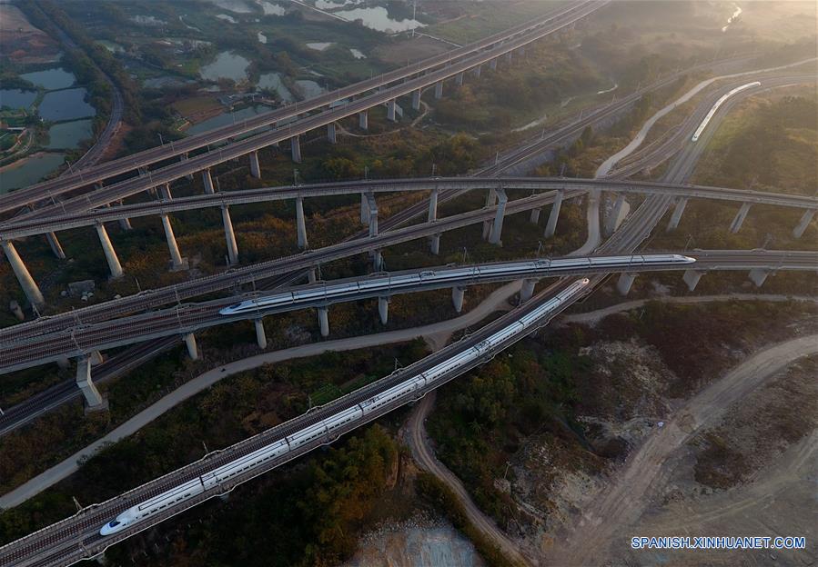 NANNING, febrero 19, 2017 (Xinhua) -- Trenes bala corren a través del puente de Tunli en Nanning, capital de la región autónoma Zhuang de Guangxi, en el sur de China, el 19 de febrero de 2017. Guangxi construirá más de 2,000km de líneas de carril de alta velocidad para unir a todas las ciudades de la región a lo largo de la vigencia del XIII Plan Quinquenal (2016-2020). (Xinhua/Huang Xiaobang)