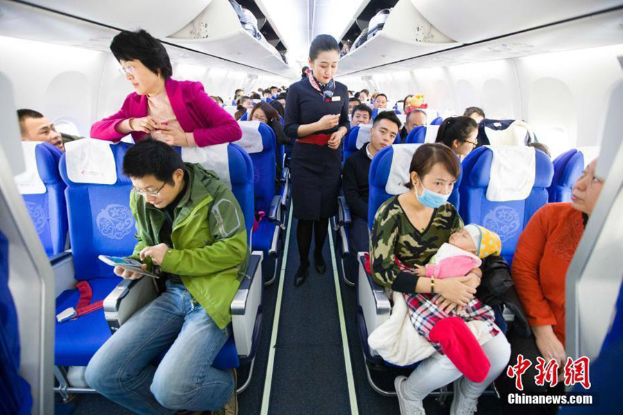 Niu Jialu cuenta el número de pasajeros antes de que el avión despegue. Niu dijo que nunca pensó en ser una auxiliar de vuelo de ni?a y ahora entiende las dificultades que pasó su madre. [Foto / chinanews.com]
