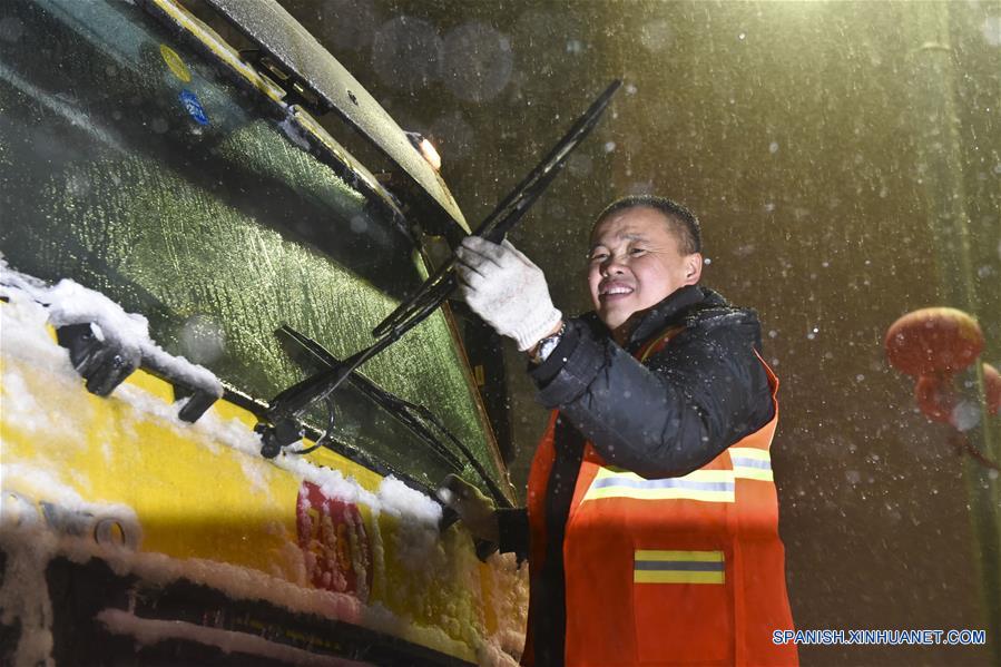 XINJIANG, febrero 20, 2017 (Xinhua) -- Un empleado quita la nieve del parabrisas de un vehículo en Urumqi, capital de la región autónoma Uygur de Xinjiang, en el noroeste de China, el 19 de febrero de 2017. Urumqi ha sido testigo de una intensa tormenta de nieve desde el domingo. (Xinhua/Hu Huhu)