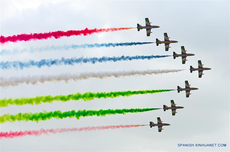 ABU DABI, febrero 20, 2017 (Xinhua) -- Aviones del equipo acrobático Al Fursan participan en un espectáculo militar durante la Exhibición y Conferencia Internacional de Defensa (IDEX, por sus siglas en inglés), en Abu Dabi, Emiratos Arabes Unidos, el 20 de febrero de 2017. De acuerdo con información de la prensa local, el IDEX comenzó en Abu Dabi el 19 de febrero, con un enfoque especial en la tecnología disruptiva. (Xinhua/Zhao Dingzhe)