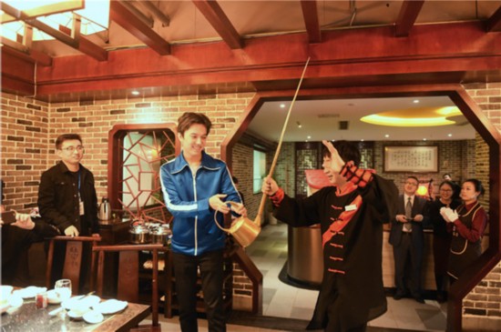 Dimash Kudaibergenov aprende a usar una tetera tradicional china en un restaurante de hotpot de Chengdu, provincia de Sichuan, 18 de febrero de 2017. [Foto de chinadaily.com.cn]