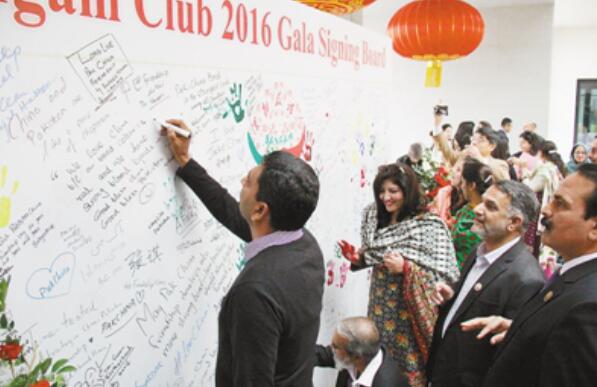 El 19 de de noviembre de 2016, los pakistaníes invitados a la ceremonia de lanzamiento de “Sangam Club” o grupo de la amistad sino-pakistaní escriben sobre el tablón buenos deseos para la amistad.( Foto: Xu Wei, Diario del Pueblo)