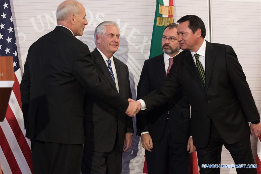 CIUDAD DE MEXICO, febrero 23, 2017 (Xinhua) -- El secretario de Relaciones Exteriores de México, Luis Videgaray (2-d), y el secretario de Gobernación de México, Miguel Angel Osorio Chong (d), y el secretario de Estado de Estados Unidos de América, Rex Tillerson (2-i), y secretario de Seguridad de Estados Unidos de América, John Kelly (i), participan durante una conferencia de prensa conjunta llevada a cabo en la Ciudad de México, capital de México, el 23 de febrero de 2017. El secretario de Relaciones Exteriores de México, Luis Videgaray, dijo en la conferencia de prensa que durante la reunión con los secretaros de Estado y Seguridad de Estados Unidos de América, Rex Tillerson y John Kelly, respectivamente, y el secretario de Gobernación de México, Osorio Chong, se acordó asumir una responsabilidad compartida en el tema de la migración, y que es un proceso que será largo, no sencillo, pero con pasos en la dirección correcta, de acuerdo con información de la prensa local. (Xinhua/Francisco Ca?edo)