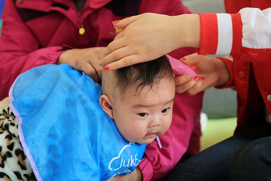 A un bebé le cortan el pelo en Huaibei, provincia de Anhui, 27 de febrero. [Foto: VCG]