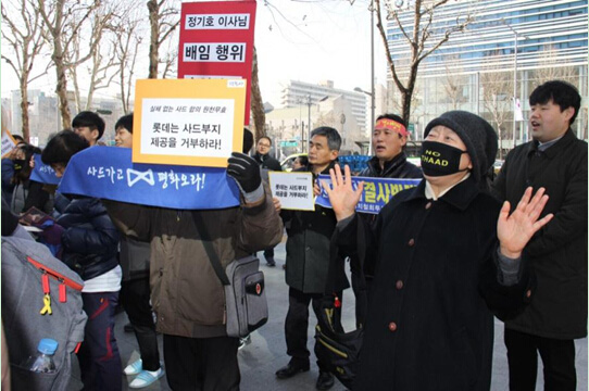 Un grupo de surcoreanos protesta delante de la sede de Lotte por el despliegue del “THAAD”.(Foto de Ma Fei, Diario del Pueblo)