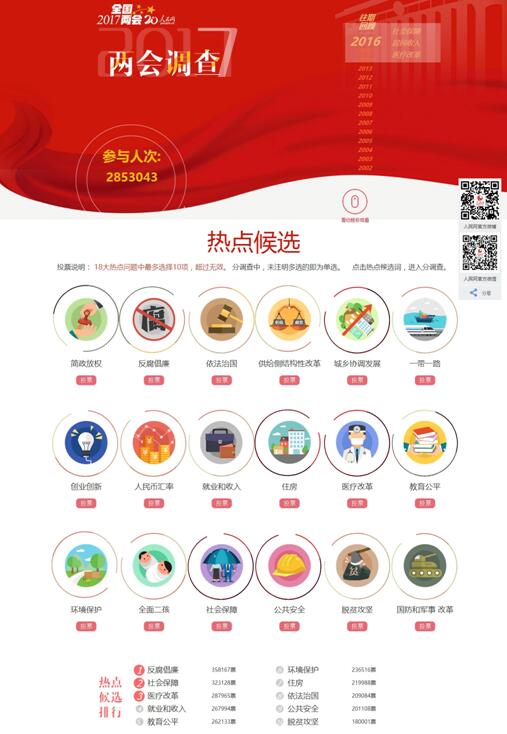 Beijing,05/03/2017(El Pueblo en Línea)-En víspera del inicio de las "dos sesiones", el Diario del Pueblo, Xinhua y los principales medios informativos chinos pusieron en marcha una encuesta sobre los principales temas a tratarse en las magnas reuniones del 2017.Los cinco primeros temas elegidos por los encuestados fueron la lucha contra la corrupción, la seguridad social, la reforma del sistemade salud, el empleo y el ingreso, y la equidad en la educación.