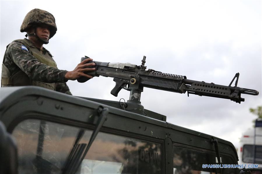 TEGUCIGALPA, marzo 6, 2017 (Xinhua) -- Un miembro de las Fuerzas Armadas de Honduras permanece sobre un vehículo militar previo a custodiar material electoral para ser distribuido en distintas partes del país, previo a las elecciones primarias, en Tegucigalpa, Honduras, el 6 de marzo de 2017. De acuerdo con información de la prensa local, las elecciones primarias se llevarán a cabo en Honduras el 12 de marzo. (Xinhua/Rafael Ochoa)