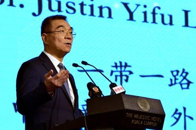 En diciembre del a?o pasado, durante el Foro Boya de la Universidad de Pekín celebrado en Kuala Lumpur, Lin ofreció un discurso sobre la estrategia "Un Cinturón – Una Ruta". (Foto : web oficial del Instituto Nacional de Investigación para el Desarrollo del de la Universidad de Pekín.)