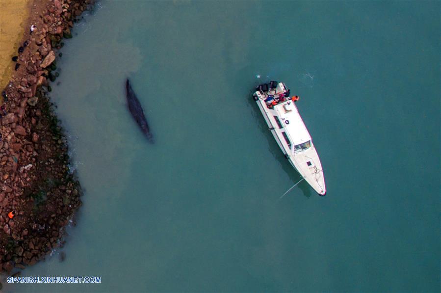 GUANGDONG, marzo 15, 2017 (Xinhua) -- Un barco de rescate permanece junto a un cachalote cerca de un muelle en el Puerto de Huizhou, en la provincia de Guangdong, en el sur de China, el 14 de marzo de 2017. Un cachalote quedó varado cerca de un muelle en Huizhou el martes. Las labores de rescate continúan con dificultad debido a que el cachalote se encuentra débil. (Xinhua/Mao Siqian)