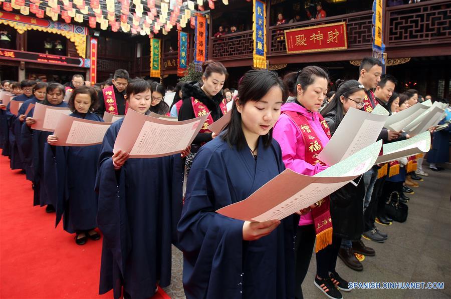 Una ceremonia es llevada a cabo en el templo Chenghuang (El Templo de la Ciudad de 0Shanghai) deseando la prosperidad de la ciudad, en Shanghai, en el este de China, el 18 de marzo de 2017. (Xinhua/Liu Ying)