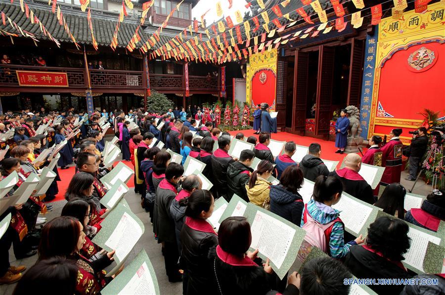 Una ceremonia es llevada a cabo en el templo Chenghuang (El Templo de la Ciudad de Shanghai) deseando la prosperidad de la ciudad, en Shanghai, en el este de China, el 18 de marzo de 2017. (Xinhua/Liu Ying)