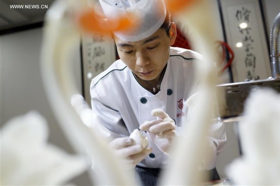 El chef Zhang Heng crea una figura de azúcar con forma de panda en un restaurante de Yinchuan, capital de la región autónoma Hui de Ningxia, el 10 de marzo de 2017. Las figuras de azúcar son adornos magníficos para las fiestas. [Foto / Xinhua]