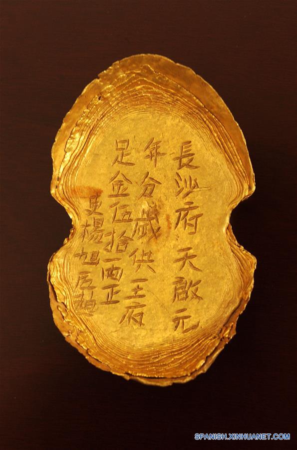 Imagen del 17 de marzo de 2017, de un lingote de oro desenterrado en el distrito de Pengshan de la ciudad de Meishan, en la provincia de Sichuan, en el suroeste de China.