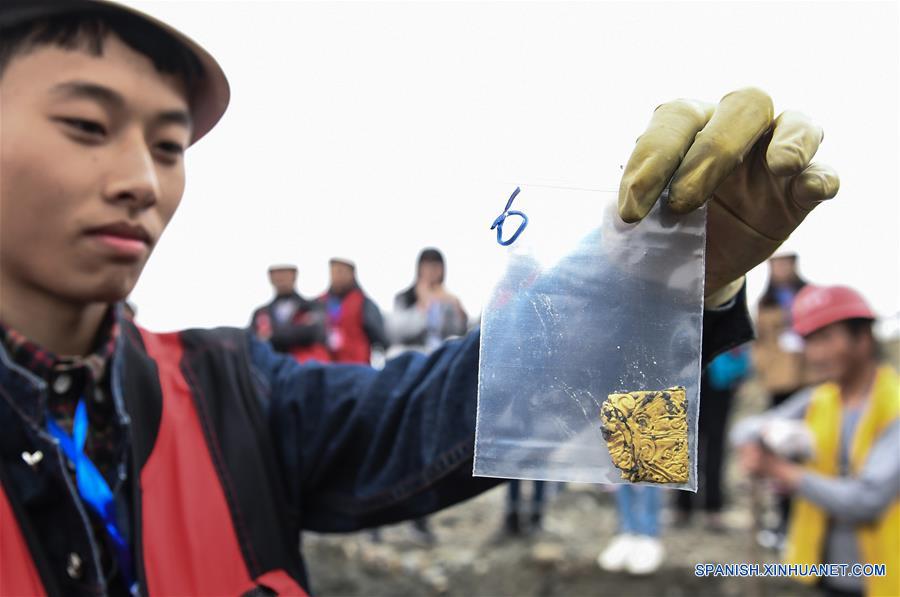 Imagen del 19 de marzo de 2017, de un hombre mostrando reliquias culturales desenterradas durante una excavación arqueológica en el distrito de Pengshan de la ciudad de Meishan, en la provincia de Sichuan, en el suroeste de China.