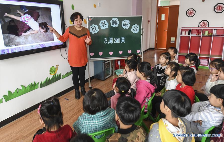 HEBEI, marzo 21, 2017 (Xinhua) -- Una maestra ense?a la forma correcta de dormir para un ni?o en un jardín de ni?os en el condado Anping, provincia de Hebei, en el norte de China, el 21 de marzo de 2017. El martes se celebra el Día Mundial del Sue?o. (Xinhua/Li Xiaoguo)