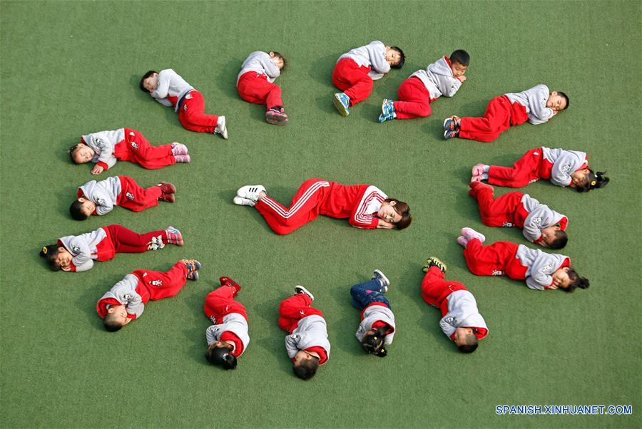 SHAANXI, marzo 21, 2017 (Xinhua) -- Ni?os y su maestra juegan a dormir en un jardín de ni?os en la ciudad Weinan, provincia de Shaanxi, en el noroeste de China, el 21 de marzo de 2017. El martes se celebra el Día Mundial del Sue?o. (Xinhua/Cui Zhengbo)