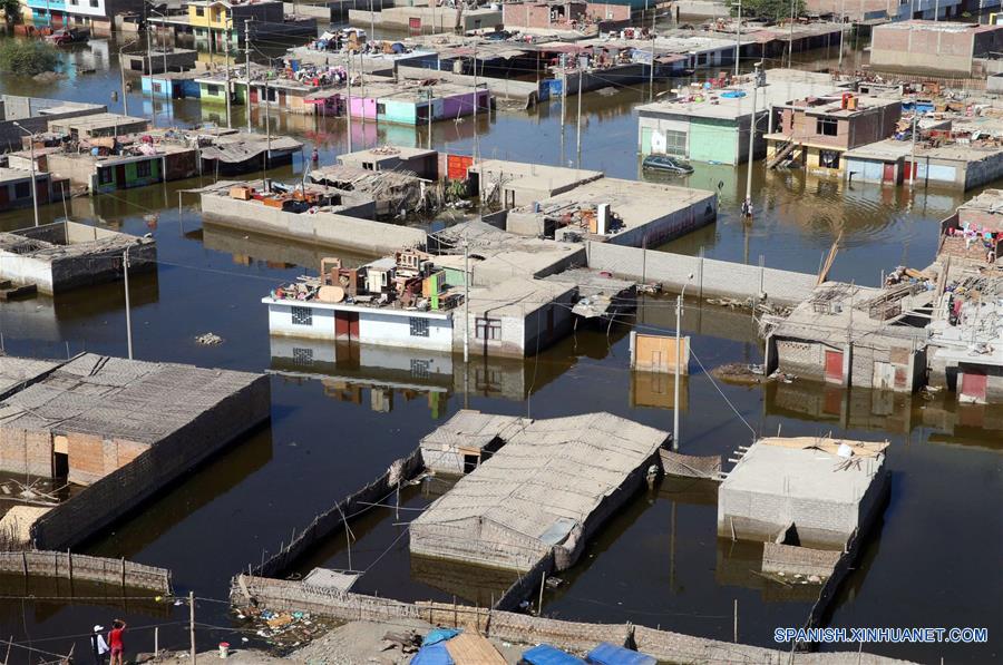 HUARMEY, marzo 22, 2017 (Xinhua) -- Viviendas permanecen semisumergidas en el agua de la inundación en la ciudad de Huarmey, en el sur de la región Ancash, Perú, el 22 de marzo de 2017. Las fuertes lluvias que se registran en Perú persistirán durante al menos dos semanas en 12 regiones del país sudamericano, informó el martes el Centro de Operaciones de Emergencia Nacional (COEN). De acuerdo con la entidad, las regiones más afectadas continuarán siendo Tumbes, Piura, Lambayeque, La Libertad y Ancash en el noroeste, Lima en el centro-este, Ica, Arequipa, Moquegua y Tacna en el sur, y Huancavelica y Ayacucho en el sureste. (Xinhua/Vidal Tarqui/ANDINA)