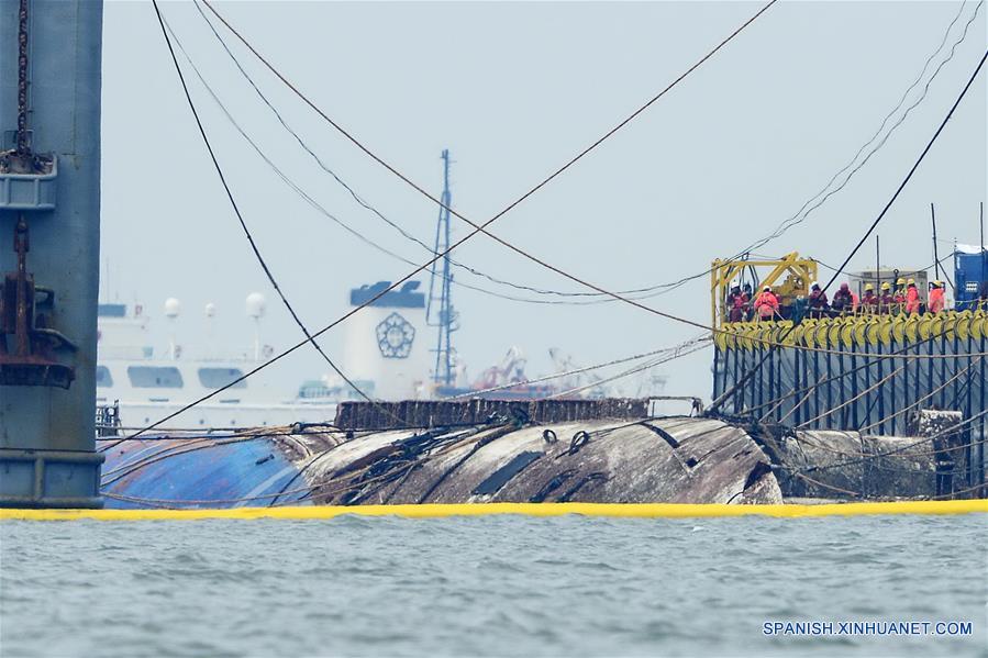 JINDO, marzo 23, 2017 (Xinhua) -- El hundido ferry de pasajeros Sewol es levantado durante sus operación de salvamento en el mar frente a la isla de Jindo, República de Corea, el 23 de marzo de 2017. La embarcación naufragó con 476 personas a bordo frente a la isla de Jindo, en la provincia de Jeolla del Sur, el 16 de abril de 2014. El hasta ahora peor accidente marítimo del país se cobró la vida de 304 personas, en su mayoría alumnos de una escuela secundaria que se encontraban en un viaje escolar. Nueve cadáveres aún no se han recuperado. (Xinhua/NEWSIS)