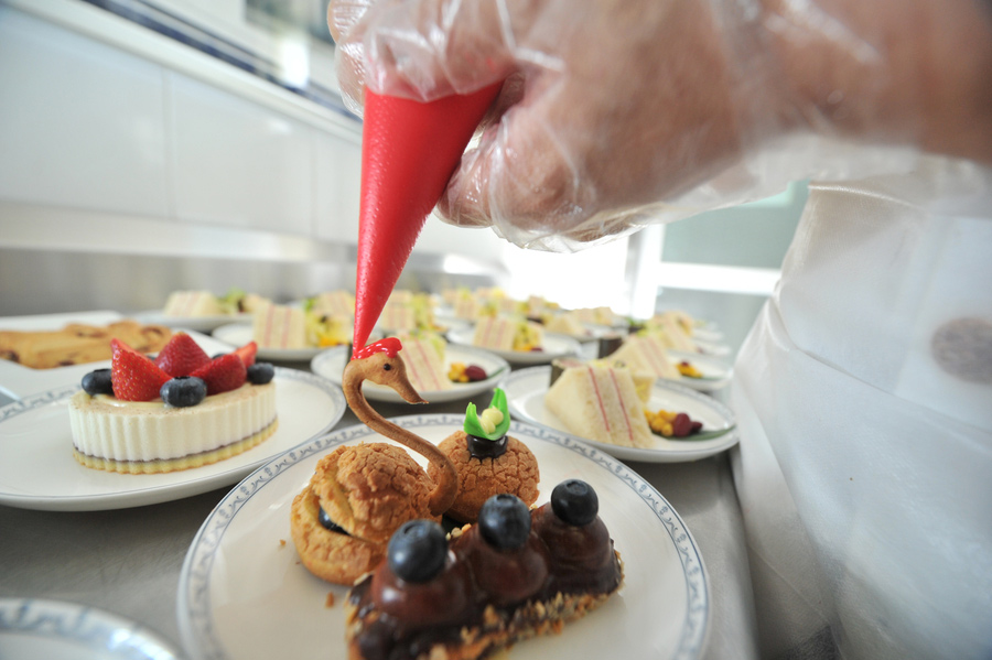 Un cocinero que pone el toque final al pastel de arándanos y frambuesa al estilo de Hainan en la oficina de catering de China Southern Airlines en Haikou, provincia de Hainan, el 22 de marzo de 2017. [Foto / VCG]