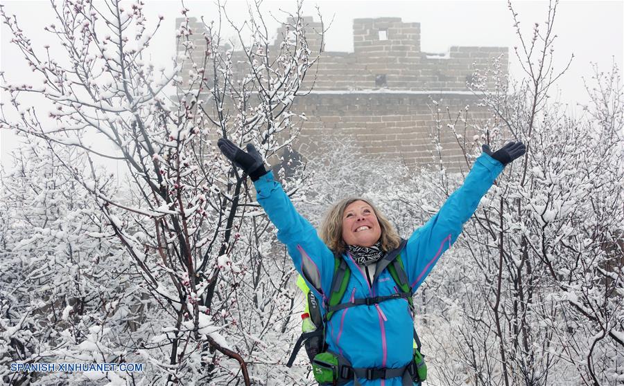 BEIJING, marzo 24, 2017 (Xinhua) -- Una turista posa en la sección nevada de Huanghuacheng de la Gran Muralla, en el suburbano distrito de Huairou de Beijing, capital de China, el 24 de marzo de 2017. Una nevada cayó el viernes en el distrito. (Xinhua/Bu Xiangdong)