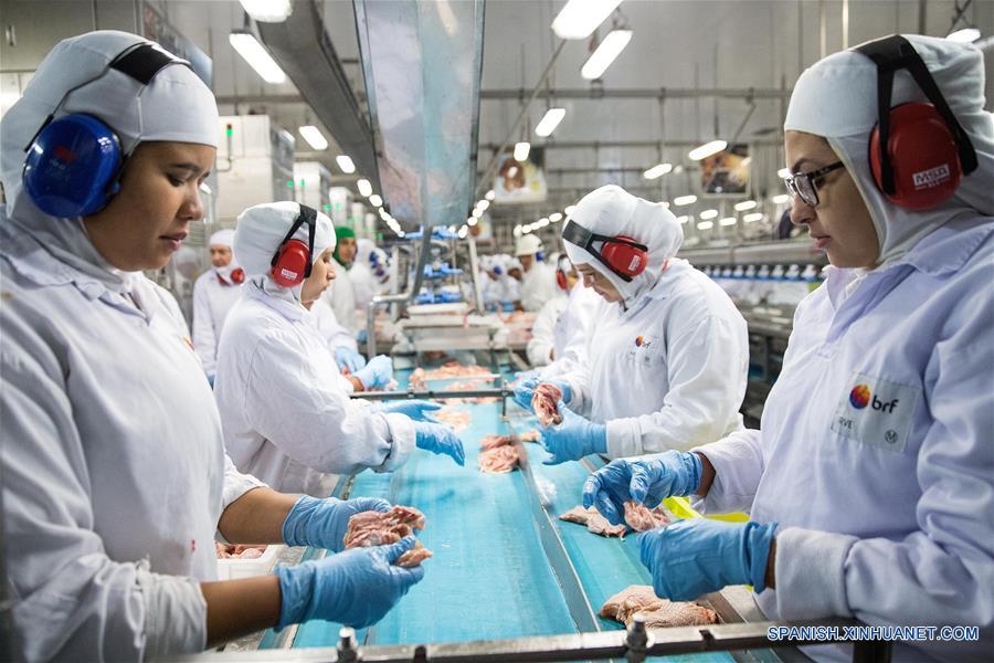 RIO VERDE, marzo 24, 2017 (Xinhua) -- Imagen del 23 de marzo de 2017 de empleadas trabajando dentro de la planta de la empresa brasile?a de alimentos Brasil Foods (BRF), en Rio Verde, en el estado de Goiás, Brasil. El ministro de Agricultura de Brasil, Blairo Maggi, aseguró el jueves que en su país se hacen controles rigurosos que garantizan la calidad de la carne que se vende al exterior e indicó que las investigaciones de la policía, sobre la red que adulteraba la carne antes de ser vendida, no ponen en duda su calidad. (Xinhua/Li Ming)