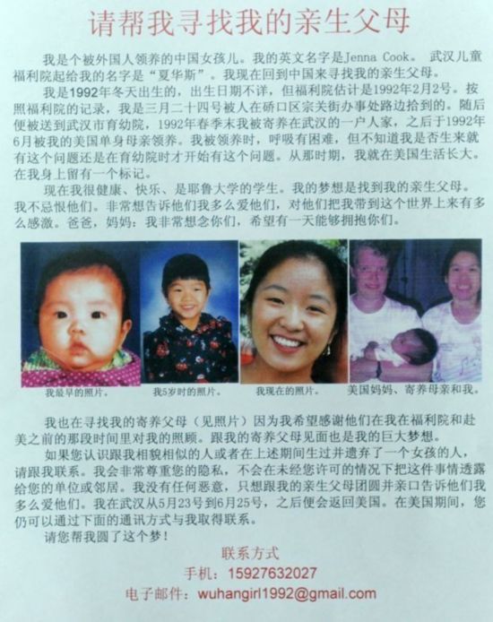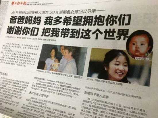 Acompa?ada por su madre adoptiva, Jenna en el 2012 viajó a Wuhan y logró publicar su historia apareciera en los periódicos locales. El artículo suscitó un gran interés público.