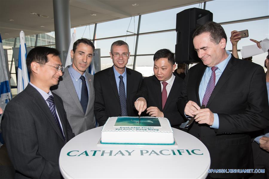 TEL AVIV, marzo 26, 2017 (Xinhua) -- El director de Desarrollo Corporativo y Tecnologías de Información de Cathay Pacific, Paul Loo (2-d), e invitados, participan durante la ceremonia previa al primer vuelo de la aerolínea de Tel Aviv a Hong Kong, en el Aeropuerto Internacional Ben Gurion en Tel Aviv, Israel, el 26 de marzo de 2017. Cathay Pacific lanzó el domingo una nueva ruta de vuelo que une a Hong Kong con Tel Aviv. La aerolínea operará 4 vuelos semanales en esta ruta, con un vuelo adicional cada semana durante la temporada alta. (Xinhua/Guo Yu)