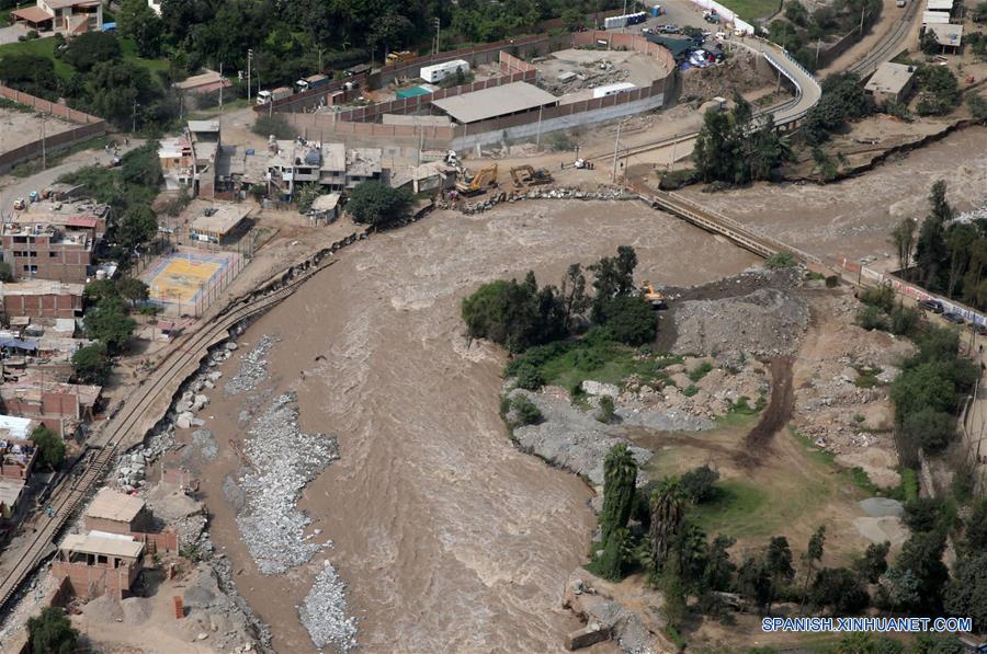 LIMA, marzo 26, 2017 (Xinhua) -- Vista aérea de la carretera central, afectada por el desborde del río Rimac, en la zona de Huarochirí, en Lima, Perú, el 26 de marzo de 2017. El Ni?o costero, que hasta el momento ha dejado al menos 90 muertos y unos 800,000 damnificados en Perú, mantenía el domingo sus afectaciones sobre la nación andina, y en la región de Piura descargaba una intensa lluvia por más de 15 horas. (Xinhua/Vidal Tarqui/ANDINA)