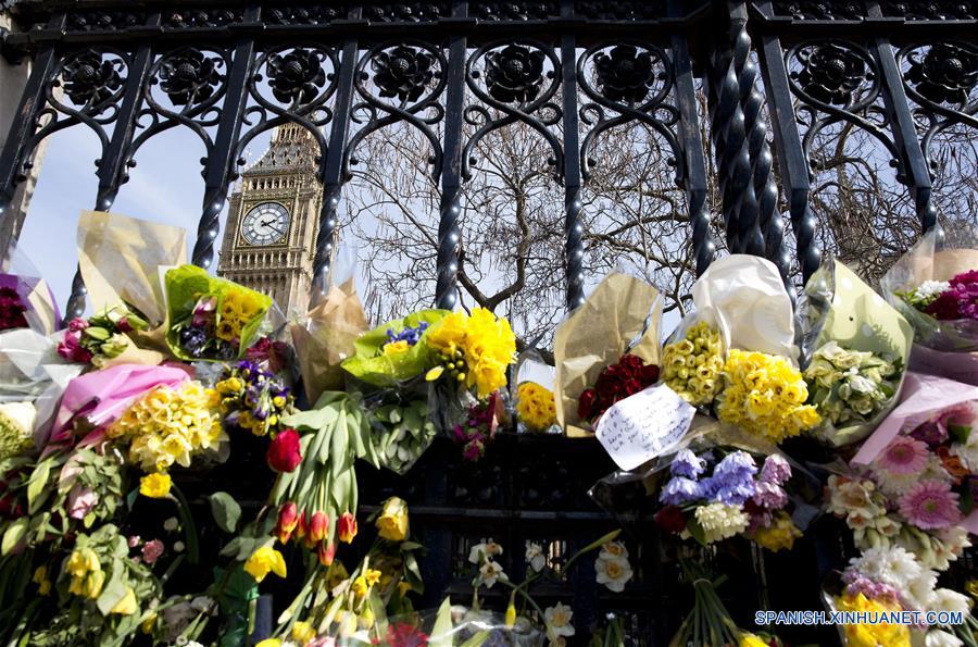 LONDRES, marzo 26, 2017 (Xinhua) -- Ofrendas florales a las víctimas permanecen frente al Parlamento cuatro días después del atentado terrorista de Westminster ocurrido el 22 de marzo, en Londres, Reino Unido, el 26 de marzo de 2017. Un hombre fue arrestado el domingo como parte de la investigación sobre el ataque terrorista perpetrado cerca del Parlamento británico, informó la policía metropolitana de Londres. La policía detuvo a un hombre de 30 a?os de edad en un domicilio de Birmingham por la sospecha de preparar ataques terroristas. El sospechoso se encuentra bajo custodia de la policía. (Xinhua/Isabel Infantes/London News Pictures/ZUMAPRESS)