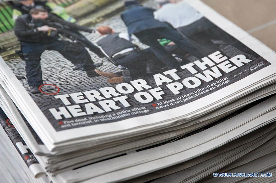 LONDRES, marzo 23, 2017 (Xinhua) -- Diarios con noticias del atentado terrorista son exhibidos en el centro de Londres, Reino Unido, el 23 de marzo de 2017. Un ciudadano chino ha resultado herido a consecuencia del ataque terrorista perpetrado el miércoles a las afueras del recinto del Parlamento británico en Londres, confirmó el jueves la embajada de China en Reino Unido. La última información publicada en el sitio web de la Embajada china recomienda a los ciudadanos chinos en este país europeo que eviten acudir a los lugares públicos concurridos o salir solos durante la noche. Según las autoridades policiales londinenses, cinco personas murieron y aproximadamente 40 sufrieron lesiones de distinta consideración, de las que siete están en estado crítico, durante el ataque terrorista del miércoles, el cual la primera ministra británica, Theresa May, tildó de "repulsivo y depravado". (Xinhua/Rob Pinney/London News Pictures/ZUMAPRESS)