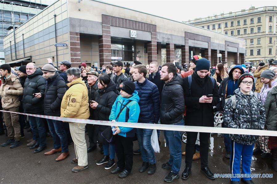 Personas reaccionan frente a la estación de metro Sennaya Ploschad después de una explosión, en San Petersburgo, Rusia, el 3 de abril de 2017. Dos estaciones del metro fueron escenario el lunes de explosiones en la ciudad rusa de San Petersburgo y hasta el momento se han reportado al menos 10 muertos y 50 heridos. Todas las estaciones del metro fueron cerradas a las 15:40 hora local (12:40 GMT) en la segunda mayor ciudad de Rusia, todas las personas fueron evacuadas. (Xinhua/Konkov Sergei/TASS/ZUMAPRESS)
