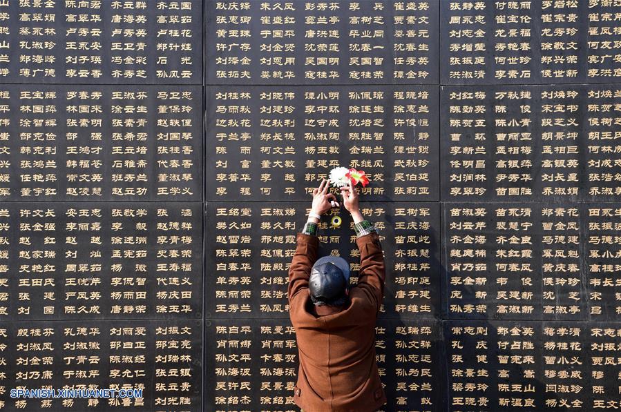 HEBEI, abril 3, 2017 (Xinhua) -- Una persona pega flores de papel junto al nombre de un familiar que falleció por el terremoto de Tangshan de 1976, frente a un muro memorial en Tangshan, la provincia de Hebei, en el norte de China, el 3 de abril de 2017. El Día de Limpieza de Tumbas, o Qingming, se celebra al inicio de abril, cuando las personas conmemoran a sus muertos visitando sus tumbas. (Xinhua/Mu Yu)