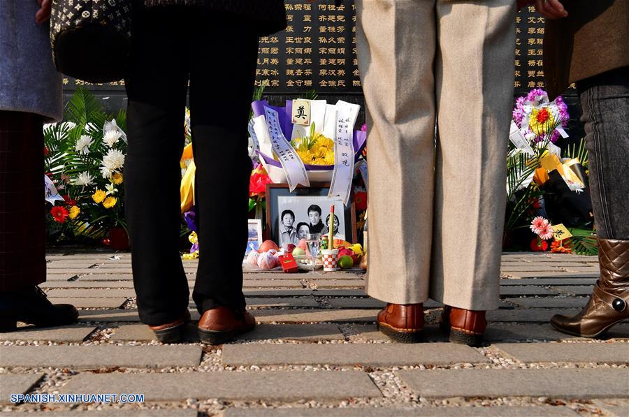 HEBEI, abril 3, 2017 (Xinhua) -- Personas lloran a sus difuntos por el terremoto de Tangshan de 1976, frente a un muro memorial en Tangshan, la provincia de Hebei, en el norte de China, el 3 de abril de 2017. El Día de Limpieza de Tumbas, o Qingming, se celebra al inicio de abril, cuando las personas conmemoran a sus muertos visitando sus tumbas. (Xinhua/Mu Yu)