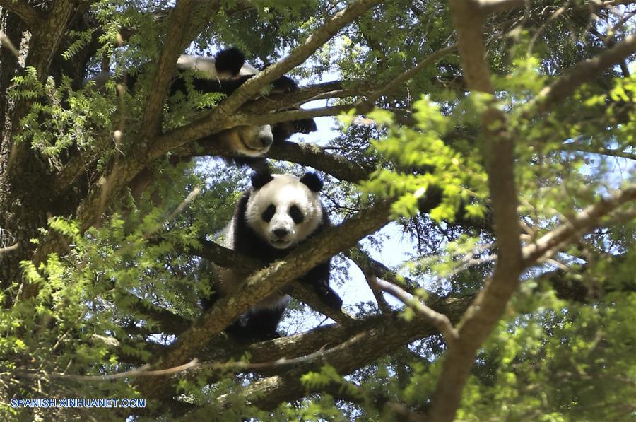 SHAANXI, abril 3, 2017 (Xinhua) -- Imagen de una cría salvaje de panda gigante permaneciendo en un árbol con su madre, en las Monta?as Qinling en la provincia de Shaanxi, en el noroeste de China. (Xinhua/Pu Chunju)