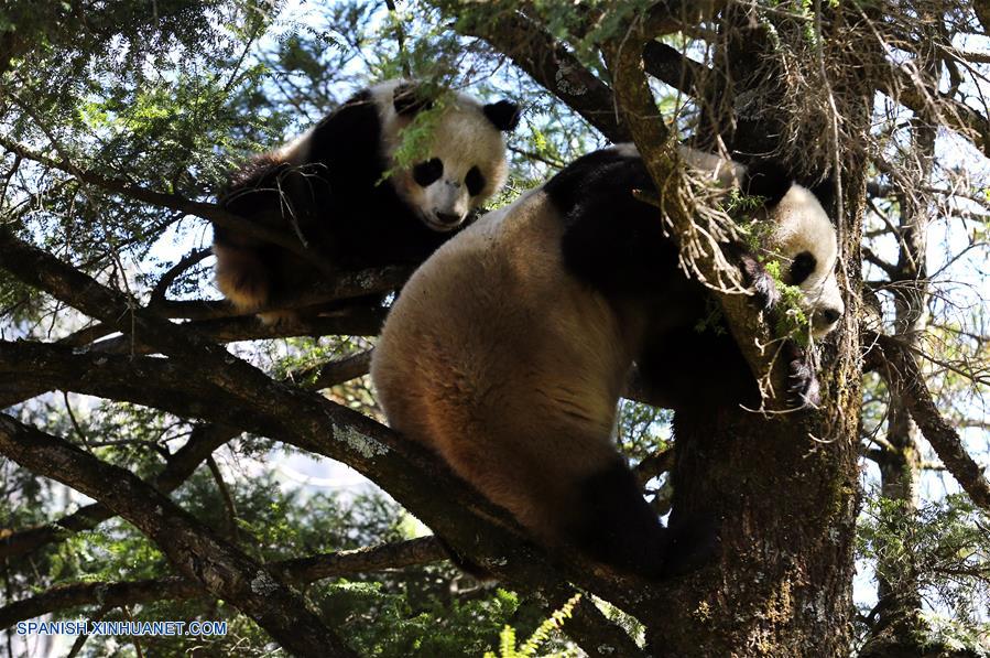 SHAANXI, abril 3, 2017 (Xinhua) -- Imagen del 1 de abril de 2017, de una cría salvaje de panda gigante permaneciendo en un árbol con su madre, en las Monta?as Qinling en la provincia de Shaanxi, en el noroeste de China. (Xinhua/Pu Chunju)