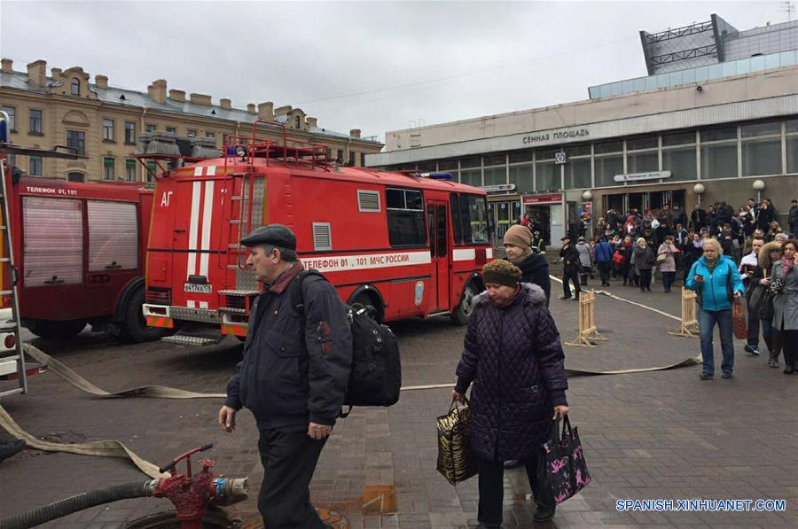 SAN PETERSBURGO, abril 3, 2017 (Xinhua) -- Bomberos permanecen frente a la entrada de la estación de metro Sennaya Ploshchad después de una explosión, en San Petersburgo, Rusia, el 3 de abril de 2017. Dos estaciones del metro fueron escenario el lunes de explosiones en la ciudad rusa de San Petersburgo y hasta el momento se han reportado al menos 10 muertos y 50 heridos. Todas las estaciones del metro fueron cerradas a las 15:40 hora local (12:40 GMT) en la segunda mayor ciudad de Rusia, todas las personas fueron evacuadas. (Xinhua/Russian Look/ZUMAPRESS)