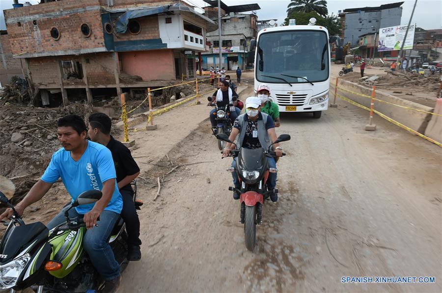 MOCOA, abril 5, 2017 (Xinhua) -- Imagen cedida por el Ministerio de Defensa (Mindefensa) de Colombia, de personas transitando en motocicletas en Mocoa, departamento de Putumayo, Colombia, el 5 de abril de 2017. La Organización Meteorológica Mundial (OMM) dijo el martes que lluvias muy intensas desencadenaron las avalanchas ocurridas el fin de semana en Colombia, pero que estos niveles "excepcionales" de lluvia no fueron la única causa y que muchos otros factores contribuyeron a la devastación. De acuerdo con una actualización de la Oficina de la Organización de las Naciones Unidas para la Coordinación de Asuntos Humanitarios, hasta el domingo se había confirmado la muerte de 254 personas en el desastre, 262 habían resultado heridas y 441 estaban desaparecidas. Se espera que estas cifras aumenten. (Xinhua/Mauricio Orjuela/Mindefensa)