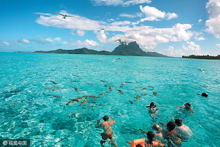 Las aguas de Bora Bora son aclamadas como el "mejor acuario natural", situado en la Polinesia Francesa. Incluso estando de pie en un lugar, la gente puede ver todo lo que les rodean. Los tiburones domesticados también se suelen acercar, pero no son peligrosos si uno permanece dentro de las zonas de seguridad. [Foto / VCG]