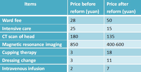 Se han introducido honorarios de servicios médicos para sustituir las cuotas separadas de inscripción, diagnóstico y tratamiento. En comparación con los 5 o 14 yuanes para la inscripción que se cobraba anteriormente, los gastos médicos para pacientes ambulatorios costarán ahora entre 50 y 100 yuanes (entre 7,2 y 14,5 dólares) dependiendo del médico, y unos 40 yuanes serán reembolsados por el seguro médico.