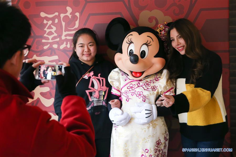 Turistas posan con un personaje de dibujos animados que porta un traje tradicional chino en el Shanghai Disney Resort, en Shanghai, en el este de China, el 11 de enero de 2017. (Xinhua/Ding Ting)