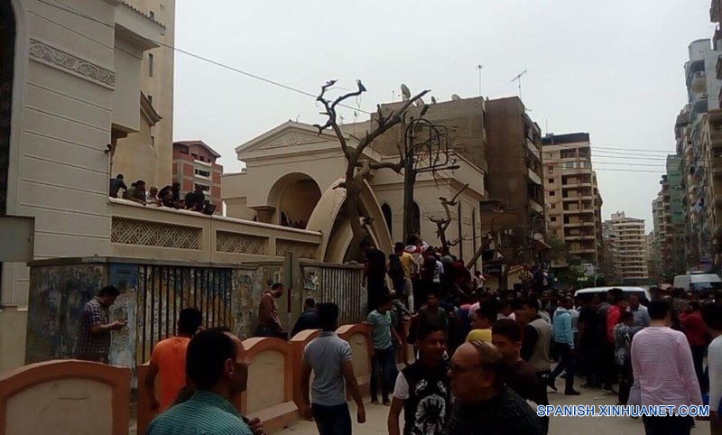 Personas se reúnen en el sitio donde se registró una explosión en Tanta, Egipto, el 9 de abril de 2017. Al menos 21 personas murieron y otras 59 resultaron heridas a causa de la explosión ocurrida el domingo en una iglesia copta localizada en la ciudad egipcia de Tanta, en el delta del Nilo, informó el Ministerio de Salud del país. (Xinhua/Ahmed Gomaa)